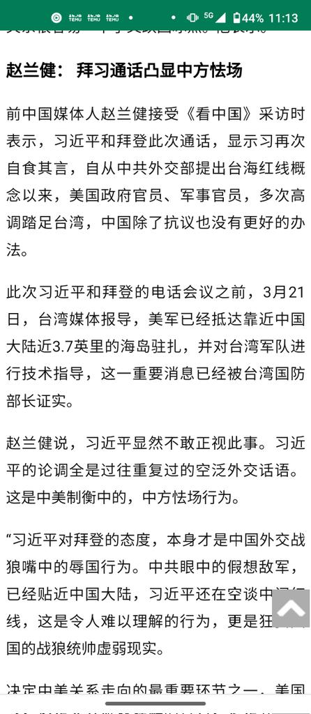 前中国媒体人赵兰健接受《看中国》采访时表示,习近平和拜登此次通话,显示习再次自食其言,自从中共外交部提出台海红线概念以来,美国政府官员、军事官员,多次高调踏足台湾,中国除了抗议也没有更好的办法。