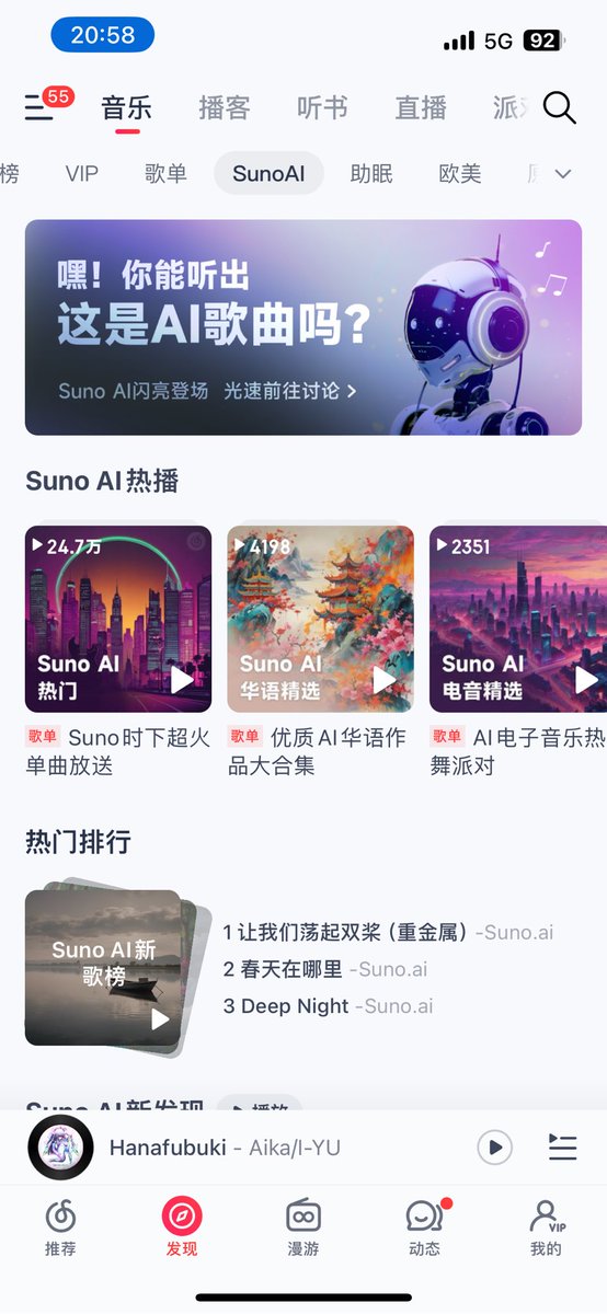 网易云音乐整了一个 Suno AI 音乐的 Tab,汇总了上传到网易云的AI 音乐。只能说搞运营还得是网易云。