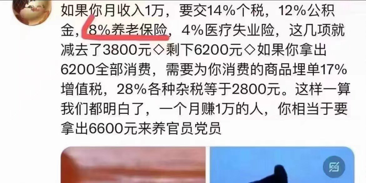 (数据请自行核实)【如果你月收入1万】要交14%个税,12%公积金,8%养老保险,4%医疗失业险,这几项就减去了3800元剩下6200元 如果你拿出6200全部消费,需要为你消费的商品埋单17%增值税,28%各种杂税等于2800元。这样一算我们都明白了,一个月赚1万的人,你相当于要拿出6600元来养官员党员