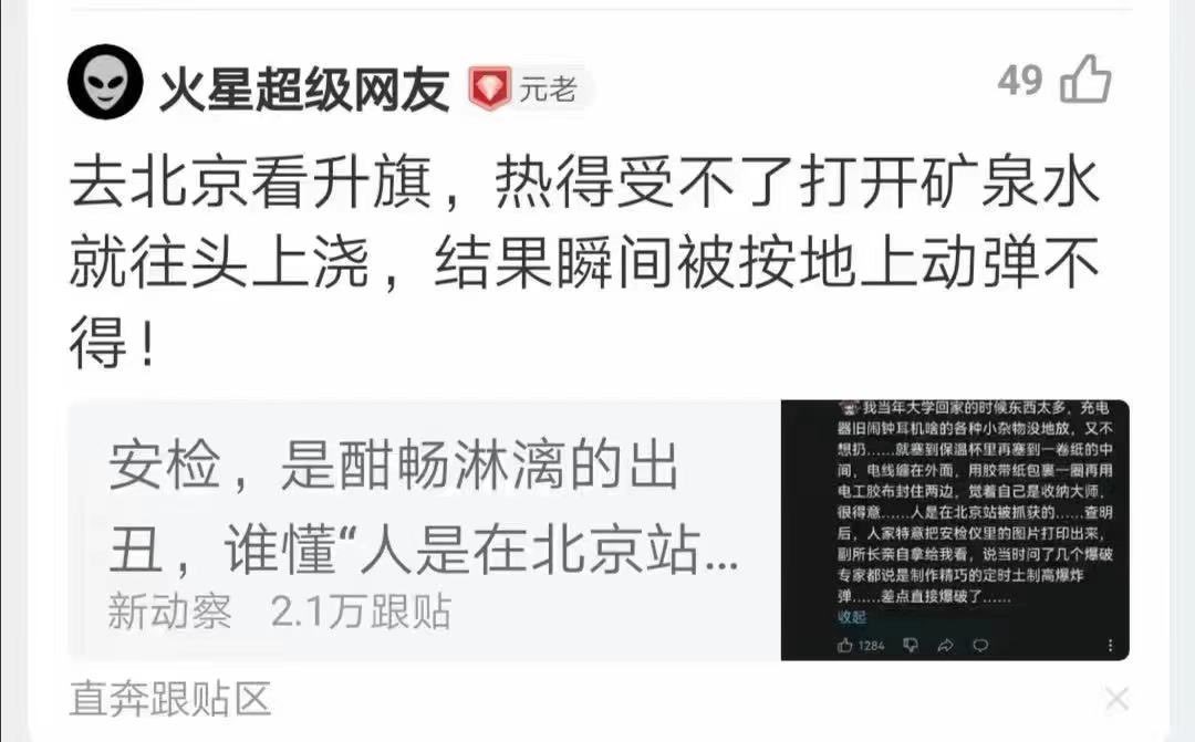 【安检笑话两则】•去北京看升旗,热得受不了打开矿泉水就往头上浇,结果瞬间被按地上动弹不得!•当年回家时东西太多,各种小杂物没地放,就塞到保溫杯里再塞到一卷纸的中间,电线缠在外面,觉着自己是收纳大师。在北京站被抓获,安检仪里图片打印出来,几个专家都说是制作精巧的定时土制高爆炸弹
