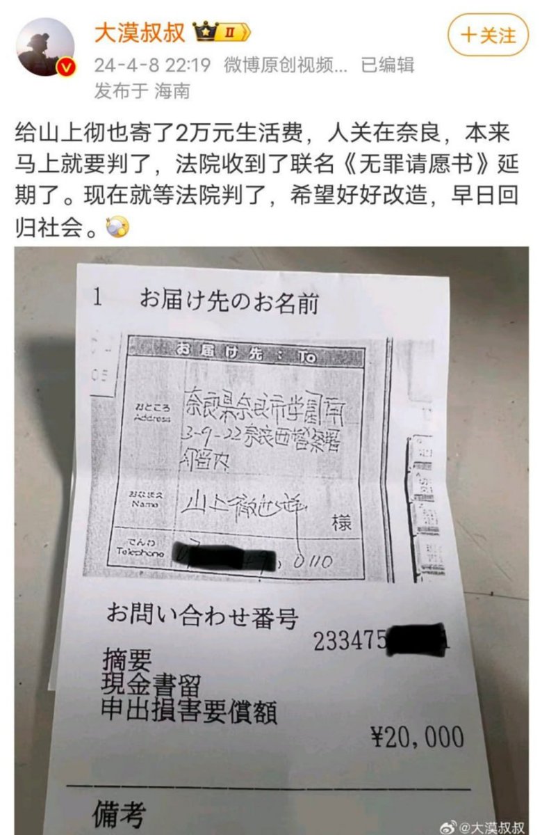 4月8日,一名爱国博主晒出收据称,自己给刺杀日本前首相安倍晋三的山上彻也寄了2万元生活费。并希望他早日回归社会。