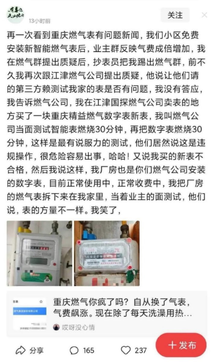 近日,不少重庆市民在网上反映,家里自从更换了新的智能燃气表后,用气的费用比之前翻了数倍。据了解,居民换表的时间多集中在去年年底,也有今年2月份前后换表的。