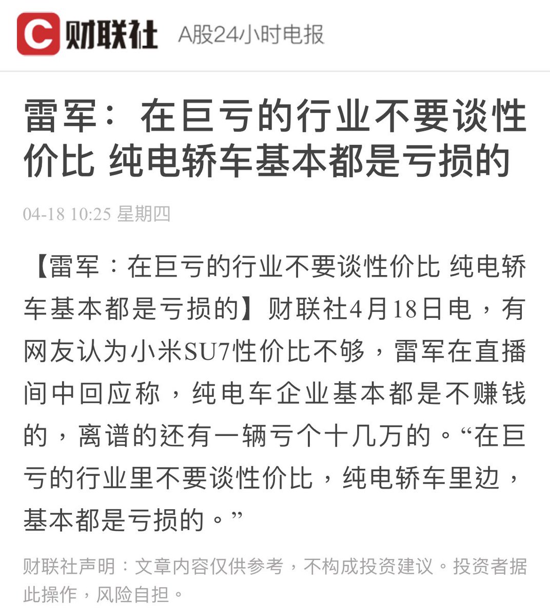 财联社4月18日:雷军近日在直播间说(中国)纯电车企业基本都不赚钱,离谱的一辆车亏几十万。“在巨亏的行业里不要谈性价比,纯电轿车里边,基本都是亏损的,”雷军说。这是一个高风险信号⚠️…