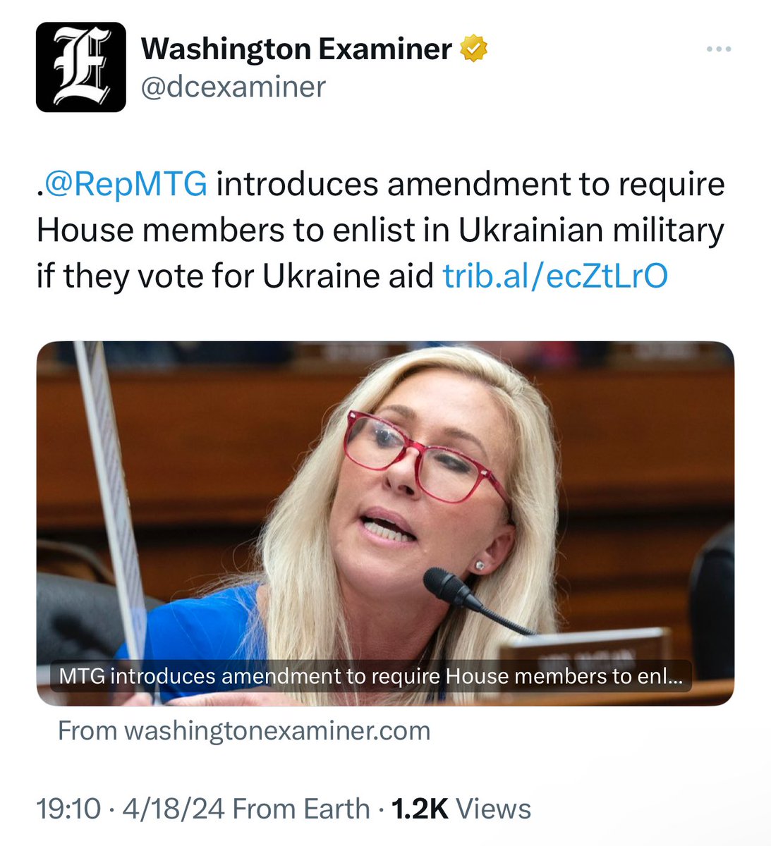 共和黨籍眾議員格林為週六即將表決的包括援烏內容法案設置新障礙,她提出一個「修正案」,要求凡是投票支持援助烏克蘭的眾議員都去烏克蘭參軍。共和黨內有些議員公開批評格林是「莫斯科格林」。