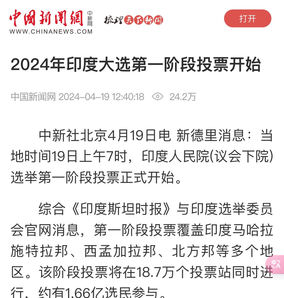 世界最大的民主国家印度开始选举莫迪也在寻求自己的第三个任期在最新的一次民调中莫迪所在的全国民主联盟NDA民调支持率在46.6%其竞争对手INDIA(印度国家发展包容性联盟)支持率在39.8%