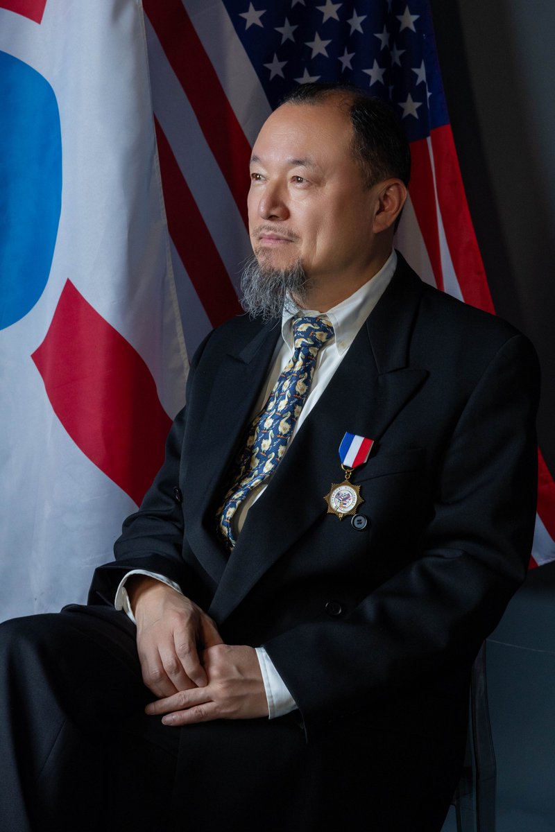 背靠美利堅合眾國,自由的國家。我是美國公民。凝望遠東上海故國,母親的家園。我在上海出生。上海之子身在紐約心系故鄉,喪國之痛無以言表。圖片說明:在2024年4月7日紐約上海獨立勳章授勳儀式上,佩戴金色滬獨勳章留念。