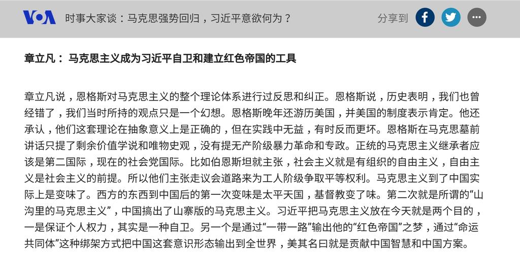 章立凡:恩格斯对马克思主义理论体系进行过反思和纠正。恩格斯说,历史表明,我们也曾经错了,我们当时所持的观点只是一个幻想。他还承认,他们这套理论在抽象意义上是正确的,但在实践中无益,有时反而更坏。恩格斯在马克思墓前讲话只提了剩余价值学说和唯物史观,没有提无产阶级暴力革命和专政。