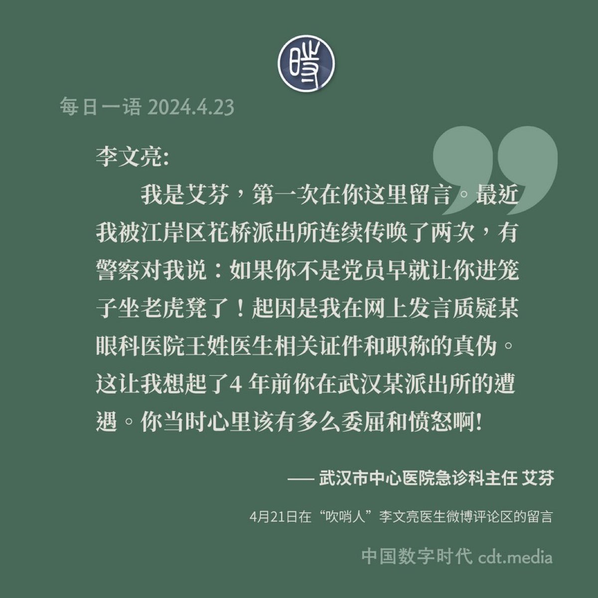 【艾芬4月21日在李文亮医生微博评论区的留言】最近我被江岸区花桥派出所连续传唤了两次,有警察对我说:如果你不是党员早就让你进笼子坐老虎凳了!起因是我在网上发言质疑某眼科医院王姓医生相关证件和职称的真伪。这让我想起了4年前你在武汉某派出所的遭遇。你当时心里该有多么委屈和愤怒啊!