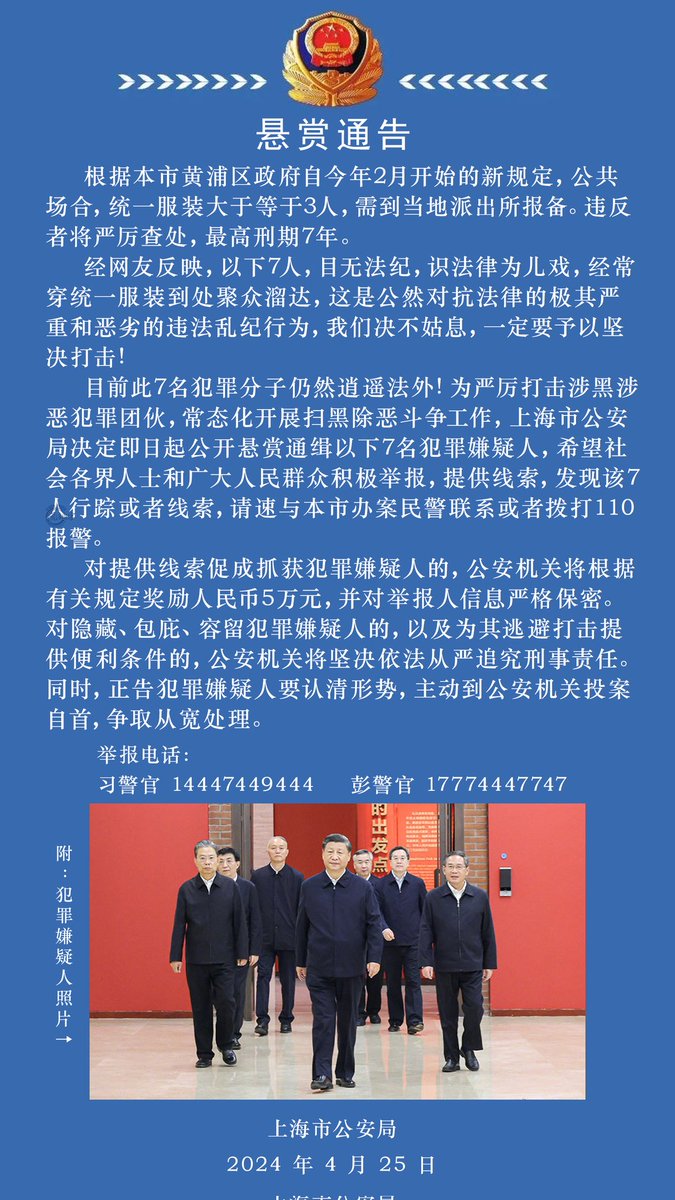上海黄埔区政府今年2月起实行新规:公共场合,3人或3人以上穿统一服装,需到当地派出所报备。违反者将严厉查处,最高刑期可至7年!不是闹着玩的! 4月24日,有4名上海市民因穿相同T恤在体育馆跑步,已被当场捉拿! 意思就是,在外面最多只能有2人可以穿同样衣服,超过3人就违法了!如果你走在街上,发现有2人跟你穿同样衣服的人,那你得赶紧跑掉,否则你就是害人害己了! 下面有一则悬赏通告,是粉红们立功且发财的好机会: