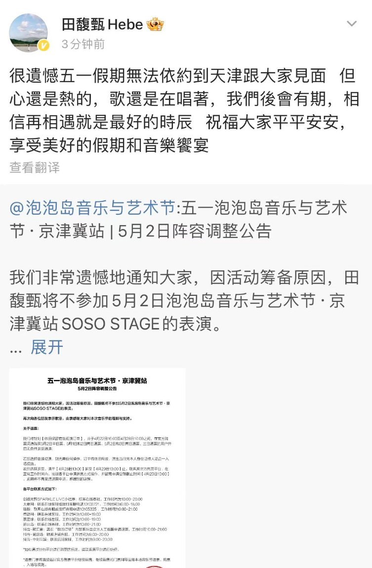 后续:田馥甄宣布退出天津泡泡岛音乐节。