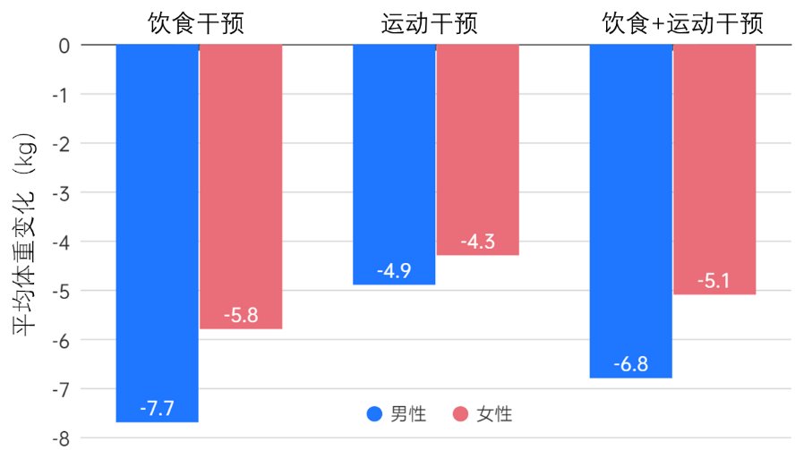 而在生活方式干预的减重效果方面,一项荟萃分析纳入58项随机对照研究的共15341例受试者显示:饮食干预、运动干预以及饮食联合运动3种生活方式干预手段在男性人群中效果略优于女性,但差异很小。