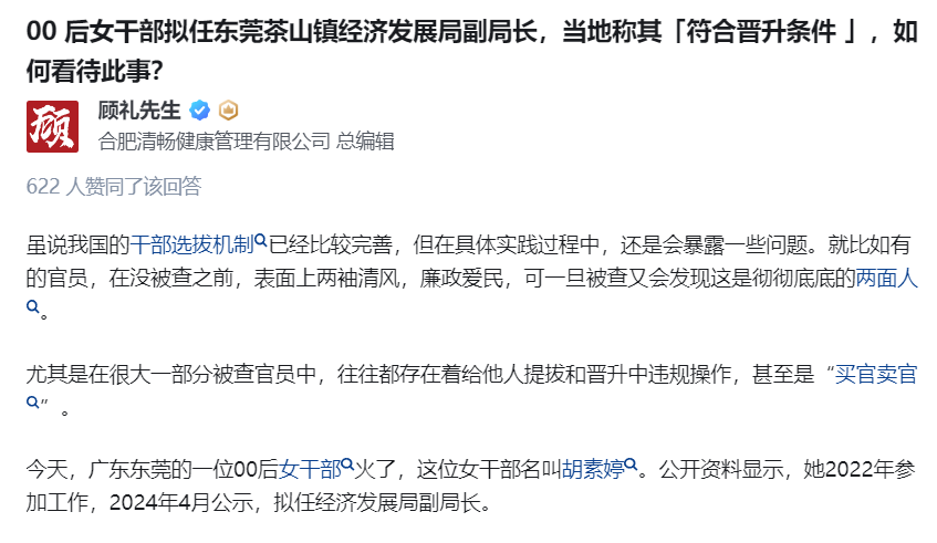 #舆情分析 有关“00 后女干部拟任东莞茶山镇经济发展局副局长”的新闻,据知乎、新浪微博和中国大陆部分门户网站讨论跟帖观察,当前舆论主要集中在升迁程序是否合理合规上。