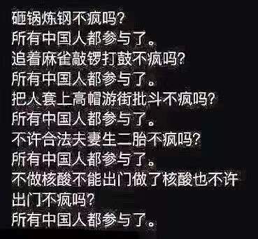 今日酷评【所有中国人都参与了】砸锅炼钢不疯吗?所有中国人都参与了。追着麻雀敲锣打鼓不疯吗?所有中国人都参与了。把人套上高帽游街批斗不疯吗?所有中国人都参与了。不许合法夫妻生二胎不疯吗?所有中国人都参与了。不做核酸不能出门做了核酸也不许出门不疯吗?所有中国人都参与了。
