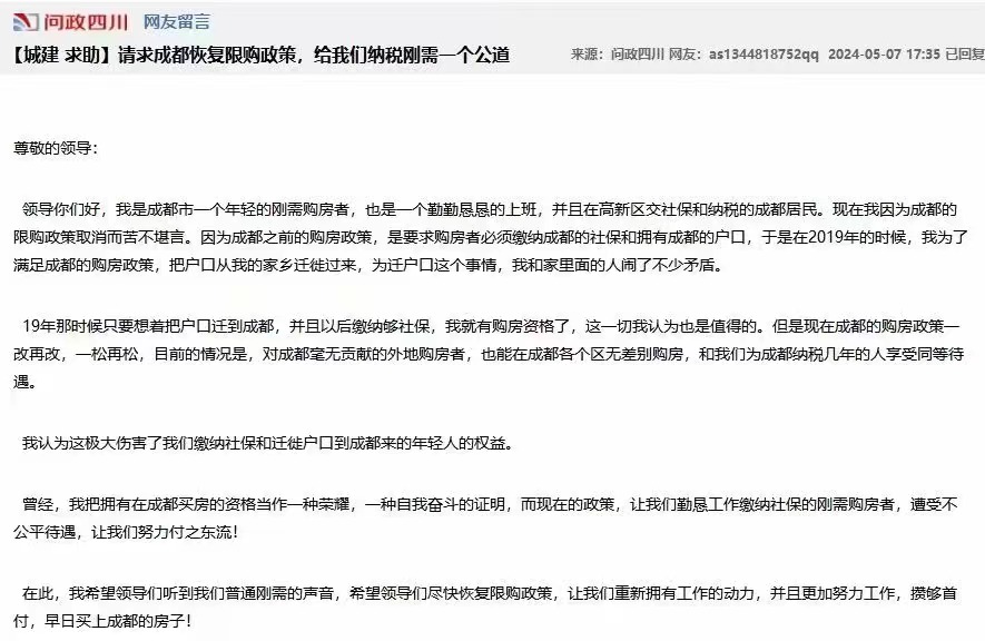 有网友要求成都恢复住房限购政策。因为对纳税多年才获得资格的人“不公道”