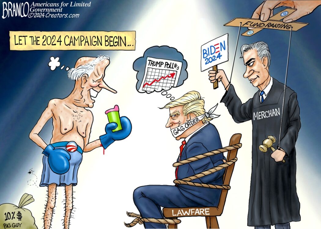 美国漫画家A.F. Branco的新作传神出当今美国政治现实:看到川普民调上升,拜登的司法打手用大量案子缠住川普,还用封口令不让他自由讲话。那个整治川普的白左法官的“上线”是民主党政客,他女儿和妻子曾给拜登捐款。捆住川普后拜登宣布:咱俩的竞选可以开始了。这幅漫画一针见血,拜登们就是这么干的。