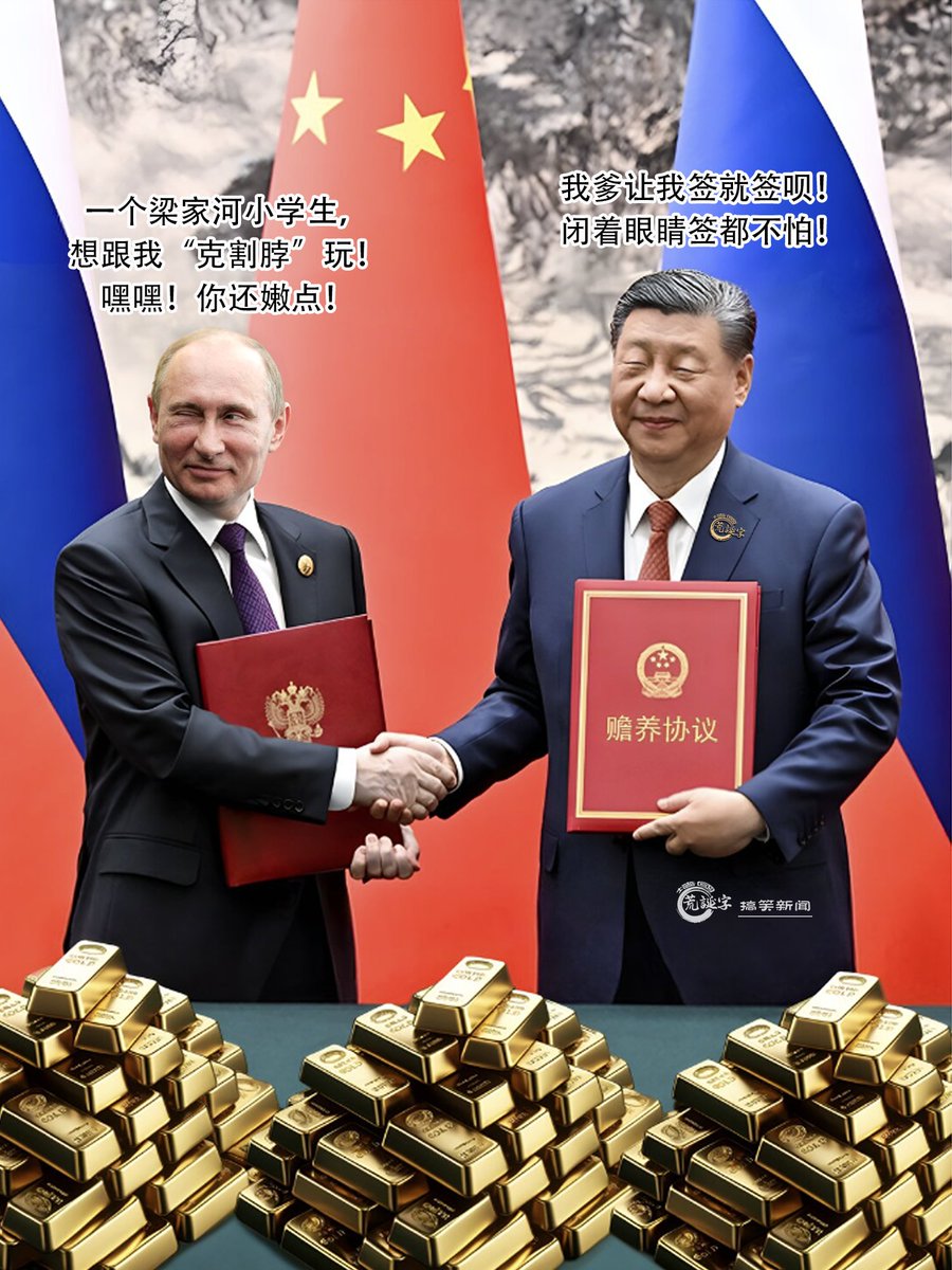 5月16日,中共国家主席习近平,在北京人民大会堂同俄罗斯总统普京,签署了《中华人民共和国和俄罗斯联邦在两国建交75周年之际关于深化新时代全面战略协作伙伴关系的联合声明》!这个联合声明文件的名字很长,其实直白点说就是孝子孝敬他俄爹的《赡养协议》,不外乎就是大撒币给钱、给物!