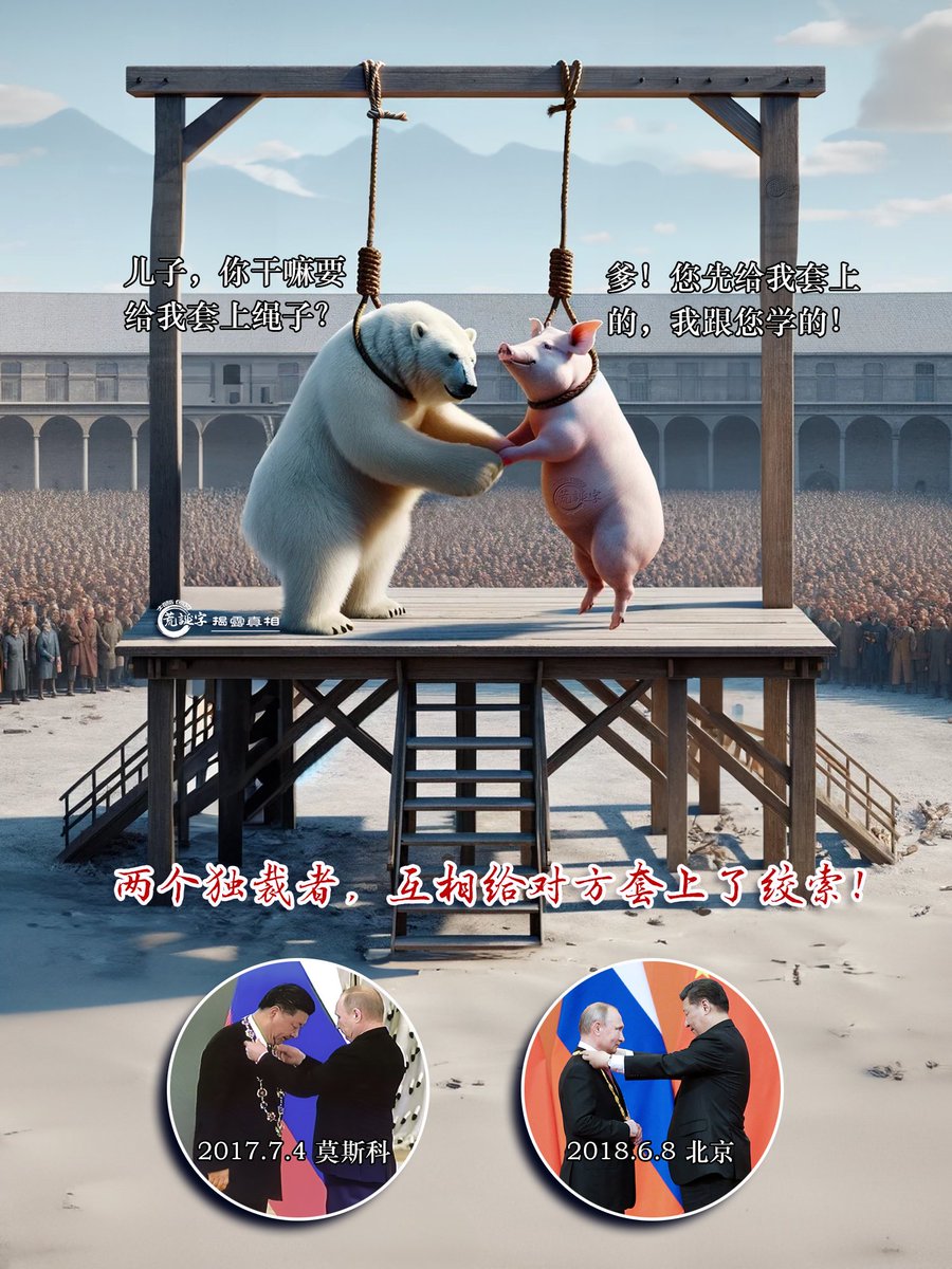 2017年7月4日, 习近平访俄时,普京给孝子脖子上挂上一条俄罗斯国家最高奖章“圣安德烈”勋章。2018年6月8日,习近平在北京人民大会堂向俄爹普京回敬一枚“友谊勋章”!在世界人民面前,演这么一出上下集连环戏,这两个独裁者在国际上已沦为一对小丑!