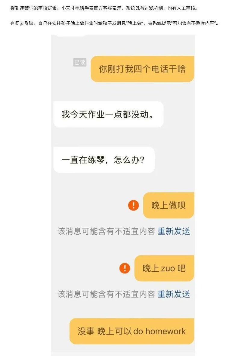 近日,在社交媒体上,有部分家长反映,自己通过墙国智能手表App跟佩戴手表的孩子聊天时,正常的聊天被系统提示“可能含有不适宜内容”,令人哭笑不得。
