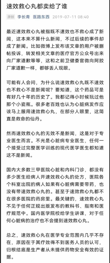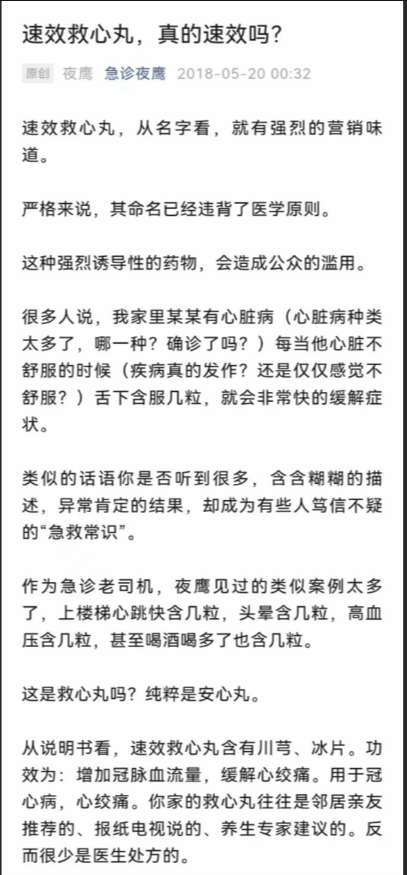 前几天贴了某地救护车上才备硝酸甘油,医院里因为集采不卖硝酸甘油只卖速效救心丸的新闻后。有人没读懂,有人可能觉得速效救心丸也许效果比硝酸甘油差一点。其实,大家记好了,它,压根没有效。这个知识点可能会救你们家老人一命。