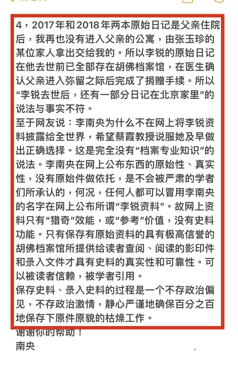 我要郑重地作一个说明:昨天我发出的有关李锐日记的整理、出版和捐赠给斯坦福大学胡佛研究所的情况介绍,是我在北京时听说的,有很多误差。今天上午我给南央姐发了个邮件,她告诉我那些不准确,她给了一个详细说明。现将南央姐说明全文贴上,请以南央姐的说明为准。