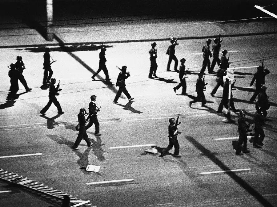 1989年6月5日,中国军队在北京长安街上行进,不分青红皂白地扫射抗议者。美联社Chinese troops march down Beijing's Chang'an Boulevard, firing indiscriminately to clear the street of protesters, on June 5, 1989. AP