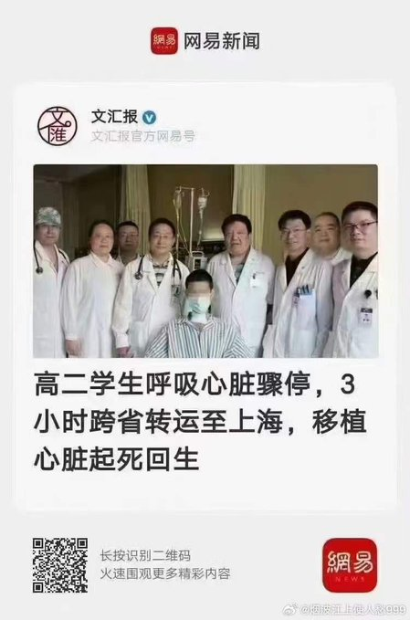 《文汇报》,是一家历史悠久的媒体,你们在宣扬这个正能量时,能够告诉读者:这个心脏来源是哪里?是谁的心脏?这个起死回生的人,他家是什么背景?他爹是干什么的?这样的新闻,才是完整的新闻;这样的媒体,才是具有公信力的媒体。