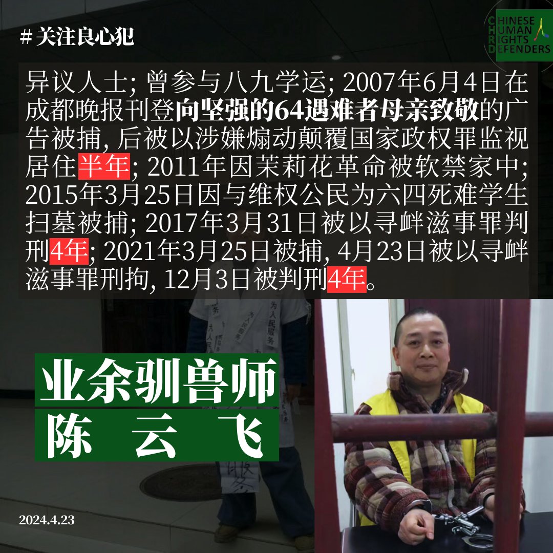 2015年3月25日,#陈云飞 与四川维权公民为六四死难学生 #肖杰 #吴国锋 扫墓,回程途中被捕;2017年3月31日被以 #寻衅滋事罪 判刑4年。1989年,陈云飞在北京农业大学读大三,5月13日第一批开始绝食,6月3日在颐和园北宫门被戒严部队殴打致昏迷。2021年3月25日他再次被捕,12月3日被判刑4年。
