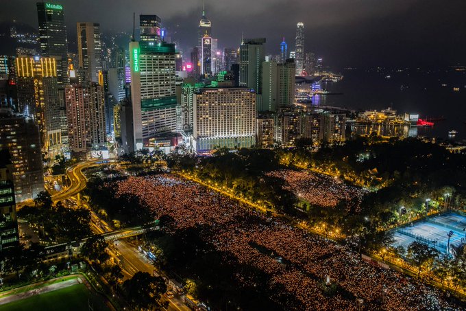 2019年6月4日,香港一年一度的烛光晚会,纪念1989年在北京天安门广场遇害的抗议者。--纽约时报