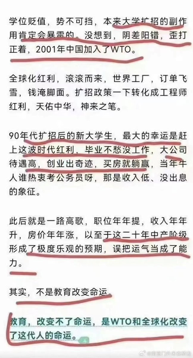 今日酷评【不是教育改变命运 】90年代扩招的大学生赶上时代红利,毕业不愁没工作,大公司待遇高,创业出奇迹,买房就躺赢…此后一路高歌,职位年年提,收入年年升,房价年年涨,以至这三十年中产阶级形成了极度乐观的预期,误把运气当成了能力。教育改变不了命运,是WTO和全球化改变了这代人的命运
