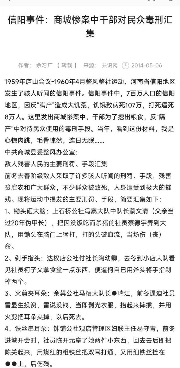 历史:余习广:信阳事件:商城惨案中干部对民众毒刑汇集。/1