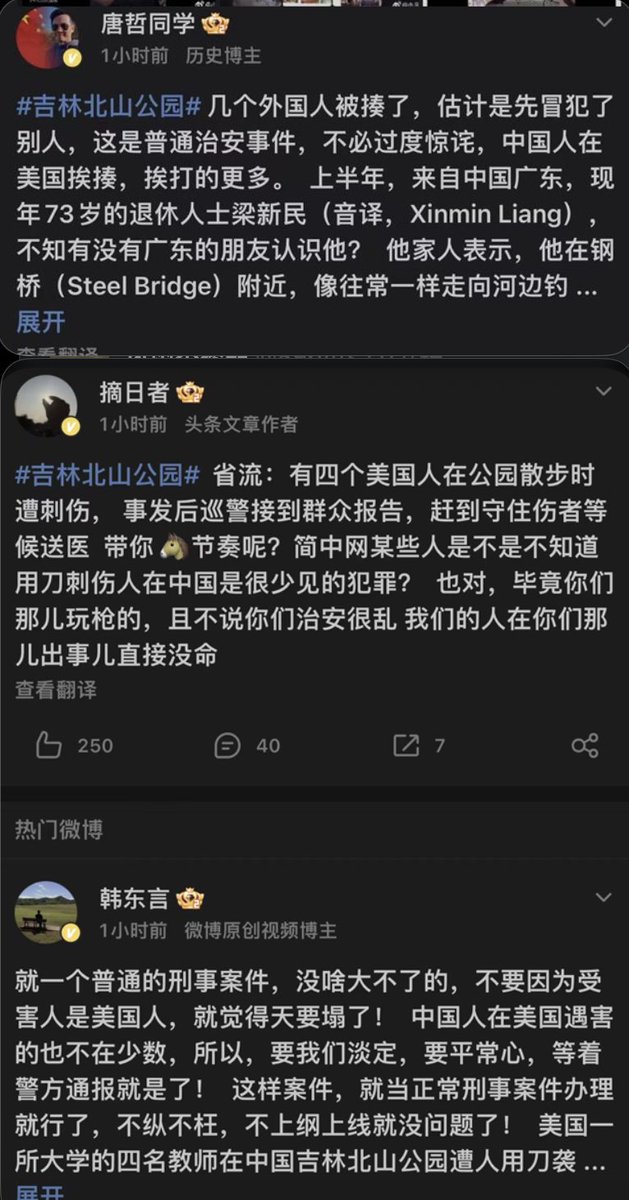 6月11日,胡锡进就吉林北山公园美国教师遇袭案发表看法,希望这只是一个偶然事件。作为唯一拥有特权可以谈论这一新闻的博主,胡锡进的言论招致广大爱国博主们的不满和讨伐。随后胡锡进的微博遭遇删帖。