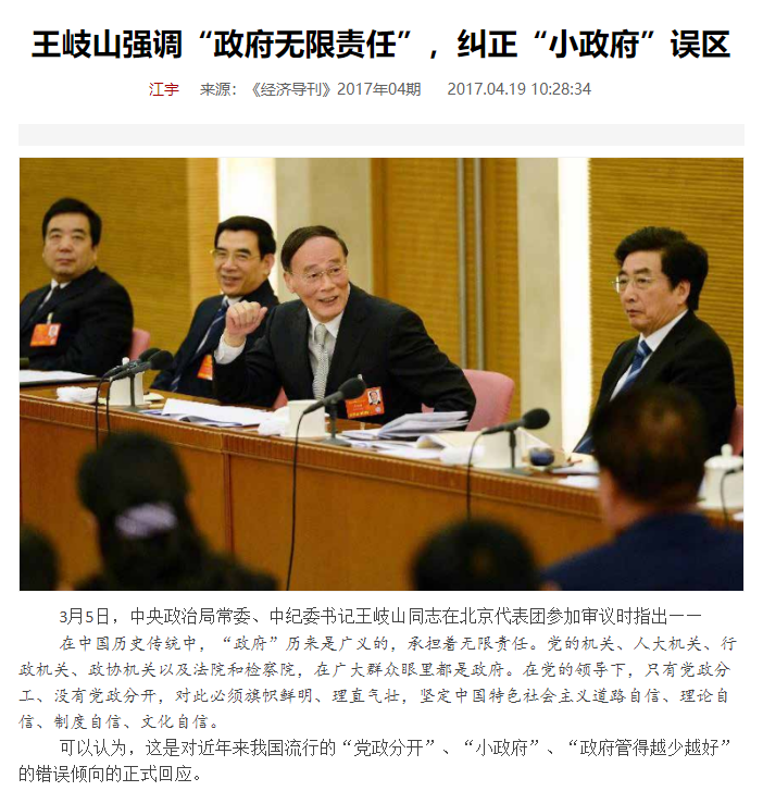 2017年王岐山说:“在党的领导下,只有党政分工,没有党政分开。”不但否定小政府,甚至还倒向无限责任政府。这是为2012年十八大以后“党政双合”做理论辩护。