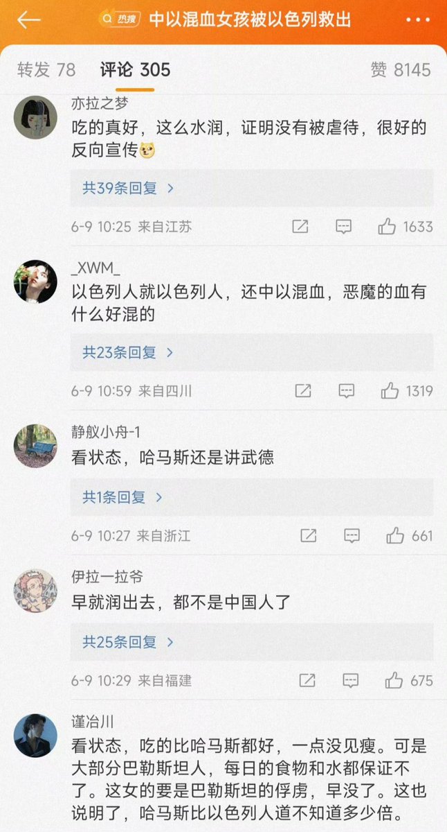 以色列救出中以混血人质的新闻下方,有网友说“还中以混血,恶魔的血有什么好混的”😅