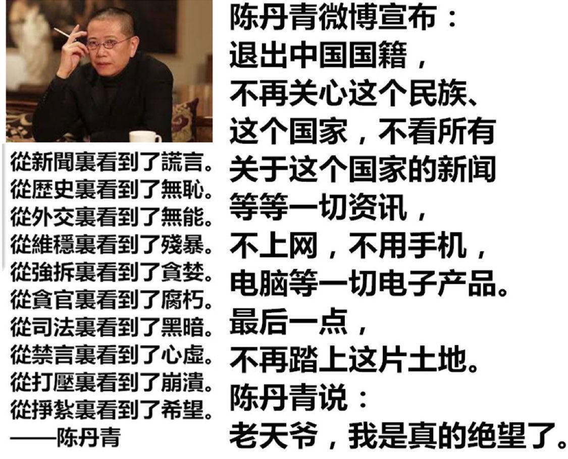 陈丹青微博宣布:退出中国国籍,不再关心这个民族、这个国家,不看所有关于这个国家的新闻等等一切资讯,不上网,不用手机,电脑等一切电子产品。最后一点,不再踏上这片土地。陈丹青说:老天爷,我是真的绝望了😞!