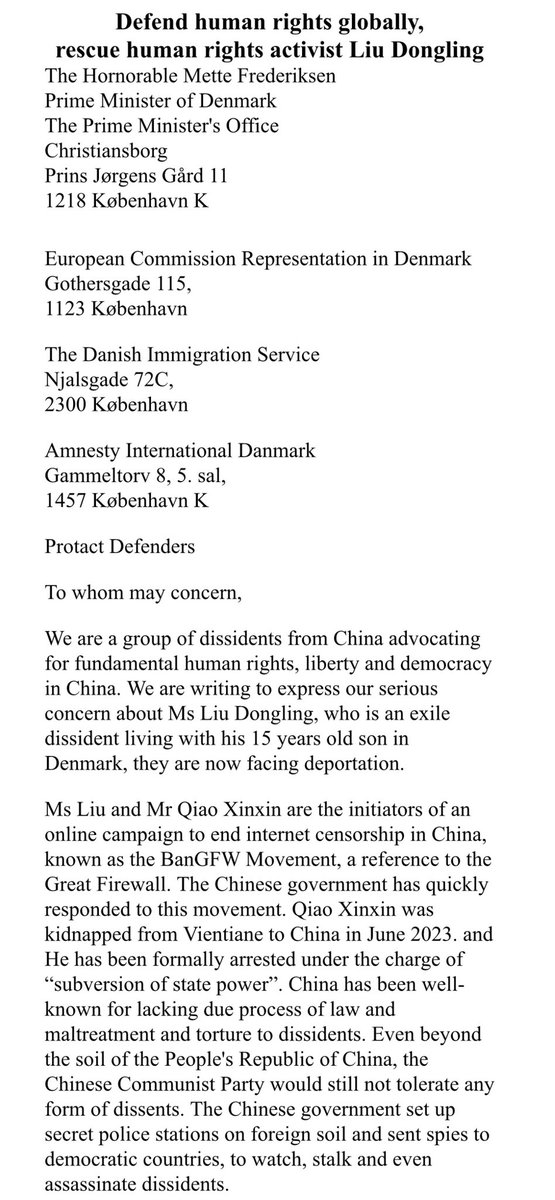 大家請@丹麥首相帳號营救及向丹麥移民局 難民署發截圖連署信到郵箱📪营救劉棟玲母子。