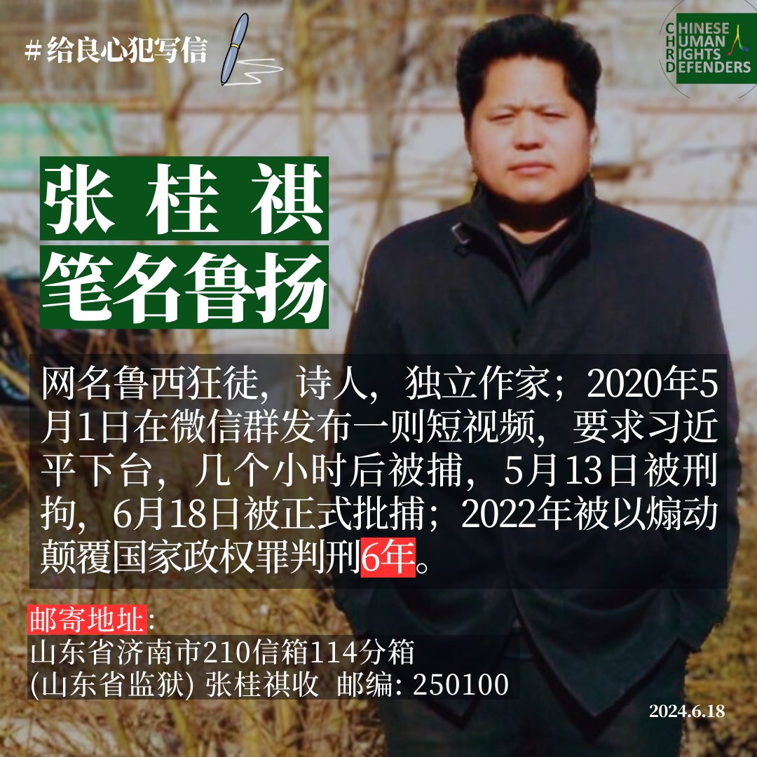 四年前的今天,#张桂祺 (笔名 #鲁扬)因在微信群发布一则短视频要求 #习近平 下台被正式批捕,2022年被以 #煽动颠覆国家政权罪 判刑6年。邮寄地址:山东省济南市210信箱114分箱(山东省监狱)邮编:250100#关注良心犯 #给良心犯写信