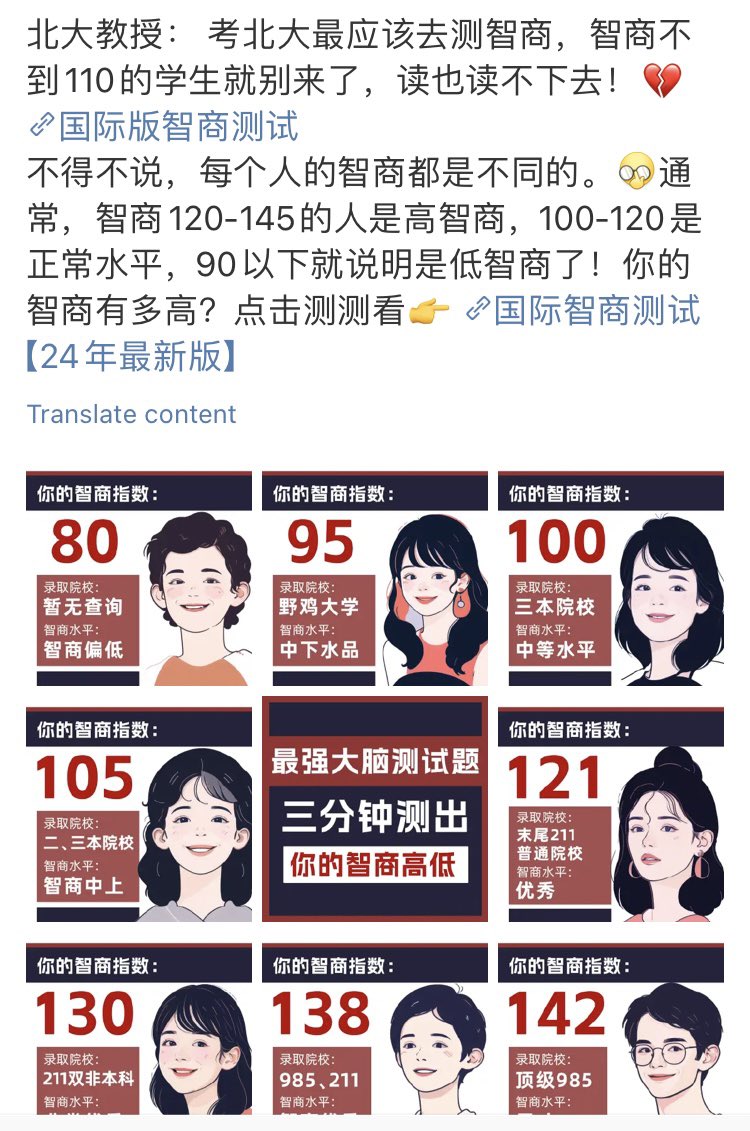 中国人的智力崇拜丝毫不影响民众一边流行反智主义,一边崇拜智力。中国人的智力崇拜里面总有一些奇奇怪怪含量:有一点社会达尔文主义,有一点拜科学教,也有一点塑造阶级和精英壁垒的意思,有一点势利眼,还有一点商业噱头,但通常情况下都是一种属于精英阶级的或者挑战阶级鸿沟的虚荣心在作祟。