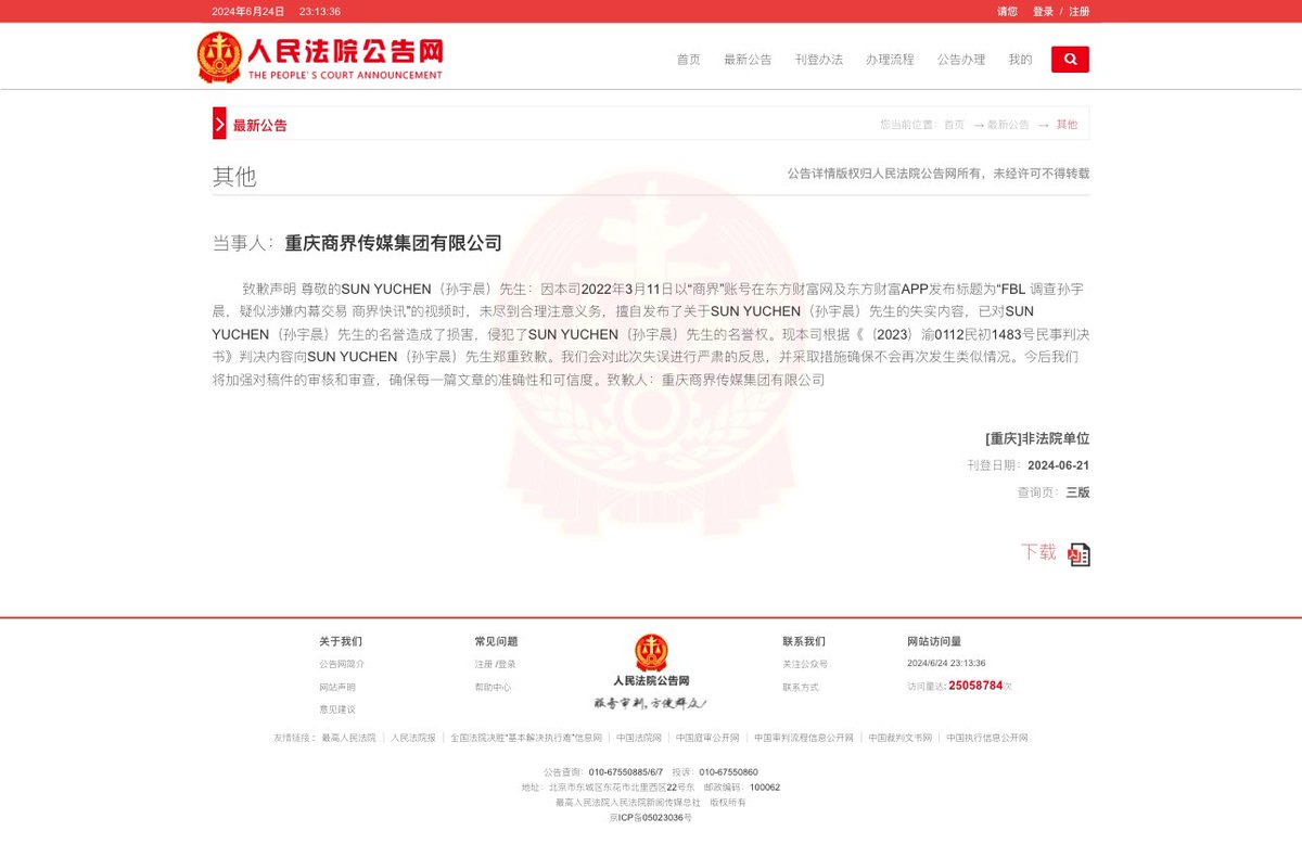 我的名誉权官司终于胜诉了!造谣者已经在人民法院网公开刊登道歉信!虽然两年了,正义虽迟但到!💪