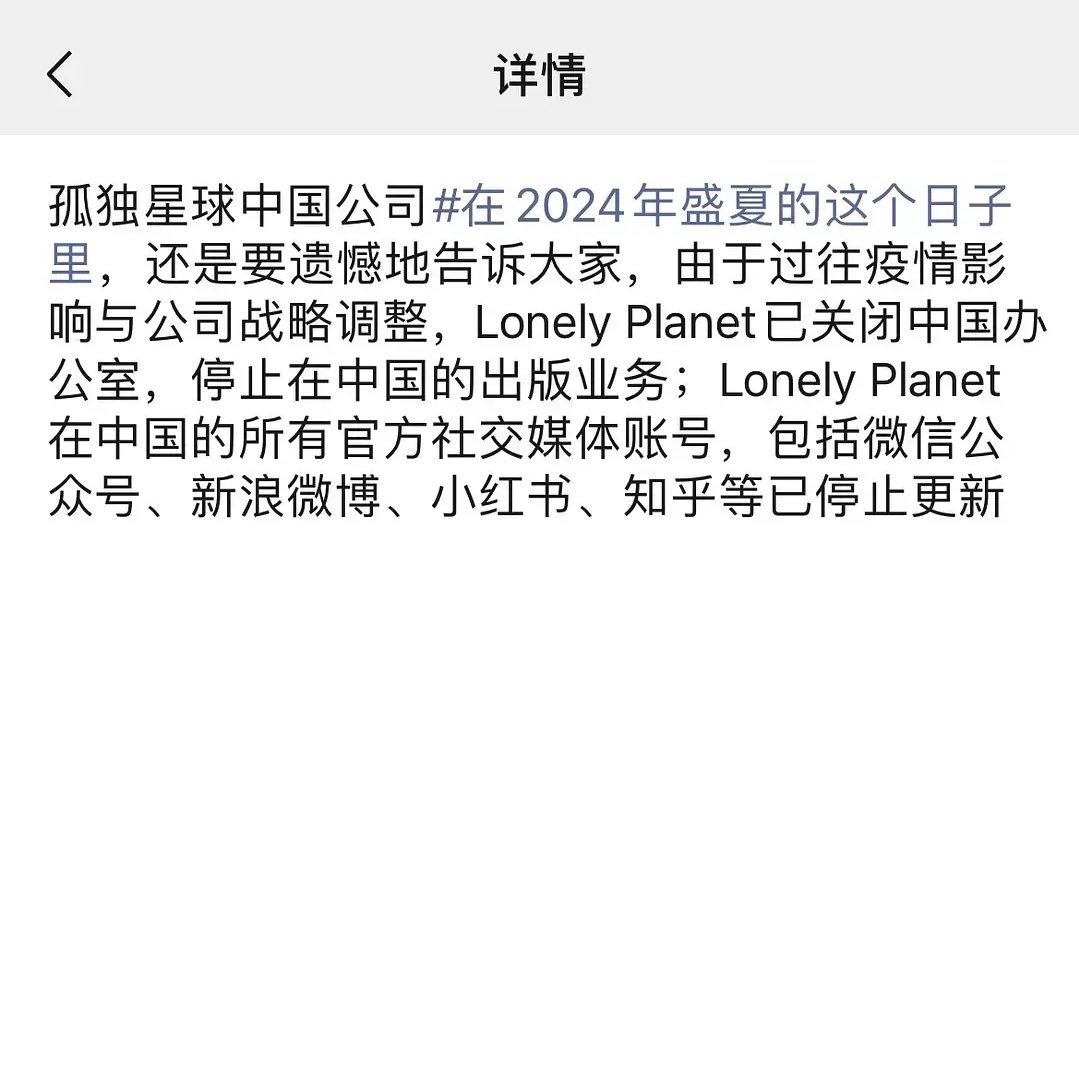 孤独星球:已关闭中国办公室,并停止在中国的出版业务。