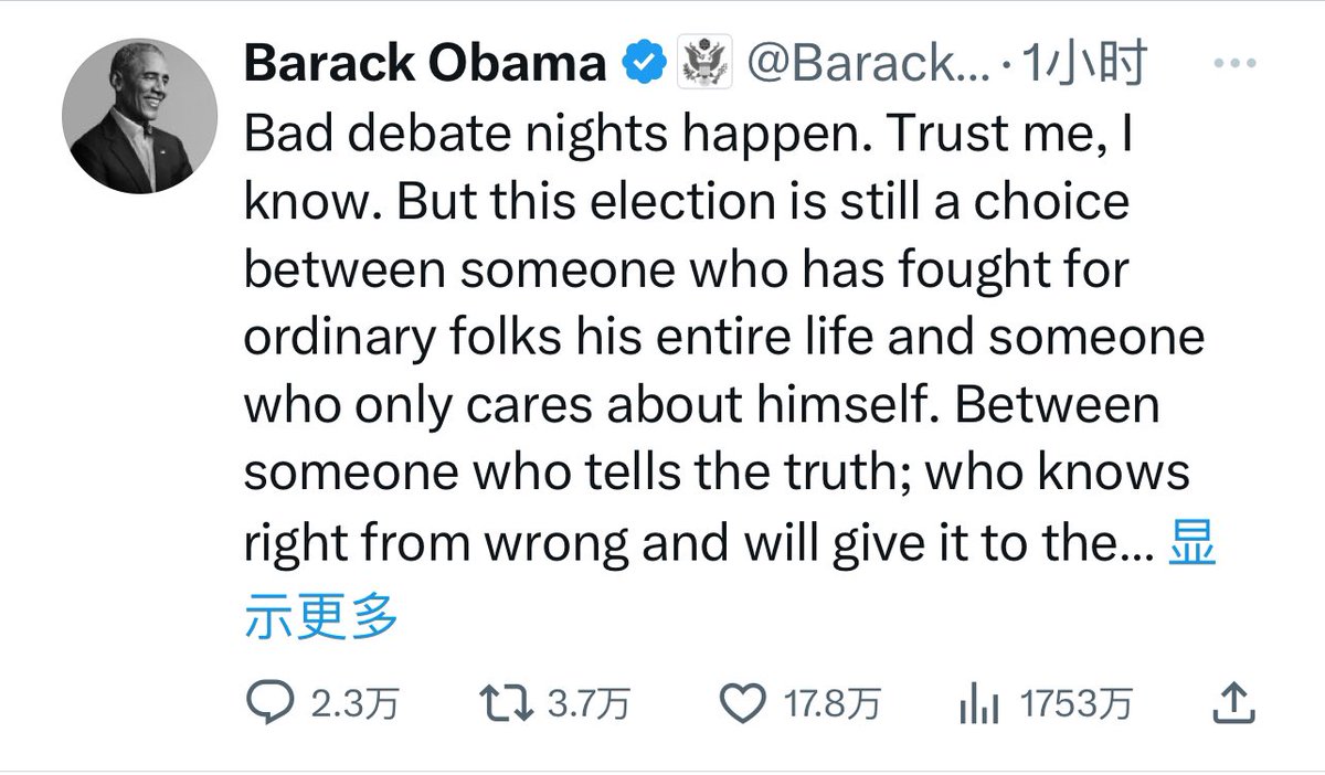 三个表态,大佬奥巴马,终于站出来了:辩论很糟糕,反对更换拜登。奥巴马的每一个棋步,我从来不会料错。当下美国的事,还是要等真正的政治大佬,发话后,再判断去向。三个小时之前,奥巴马在滔天的质疑拜登浪潮声中,站出来了。不像哈马斯屠杀以色列后,48小时后才表态,这一次,民主党内的天真派,对拜登的逼宫,声势浩大,从昨晚到现在,通过CNN,铺天盖地的是拜登僵化表情,尴尬的神态,民主党内的学院派,更是通过纽约时报,直接喊话拜登走人换新。
