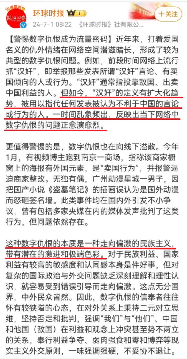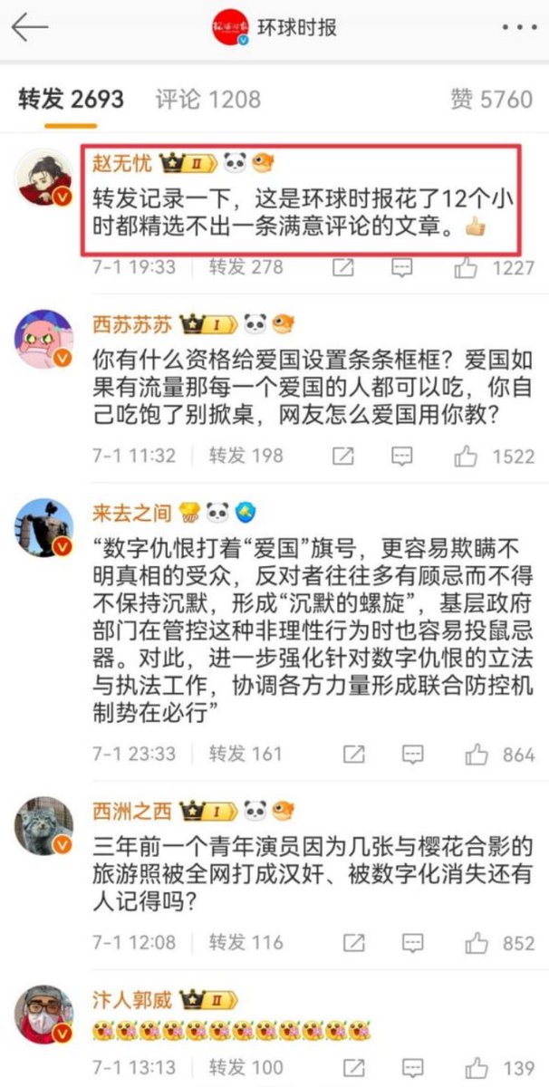 7月1日,环球时报发文称,警惕数字仇恨成为流量密码。但评论区却开启了精选评论。