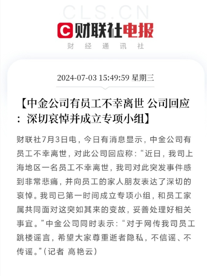 7月3日,网传中金公司一员工因公司降薪,导致房贷压力过大而跳楼。 中金公司回应:深切哀悼并成立专项小组。