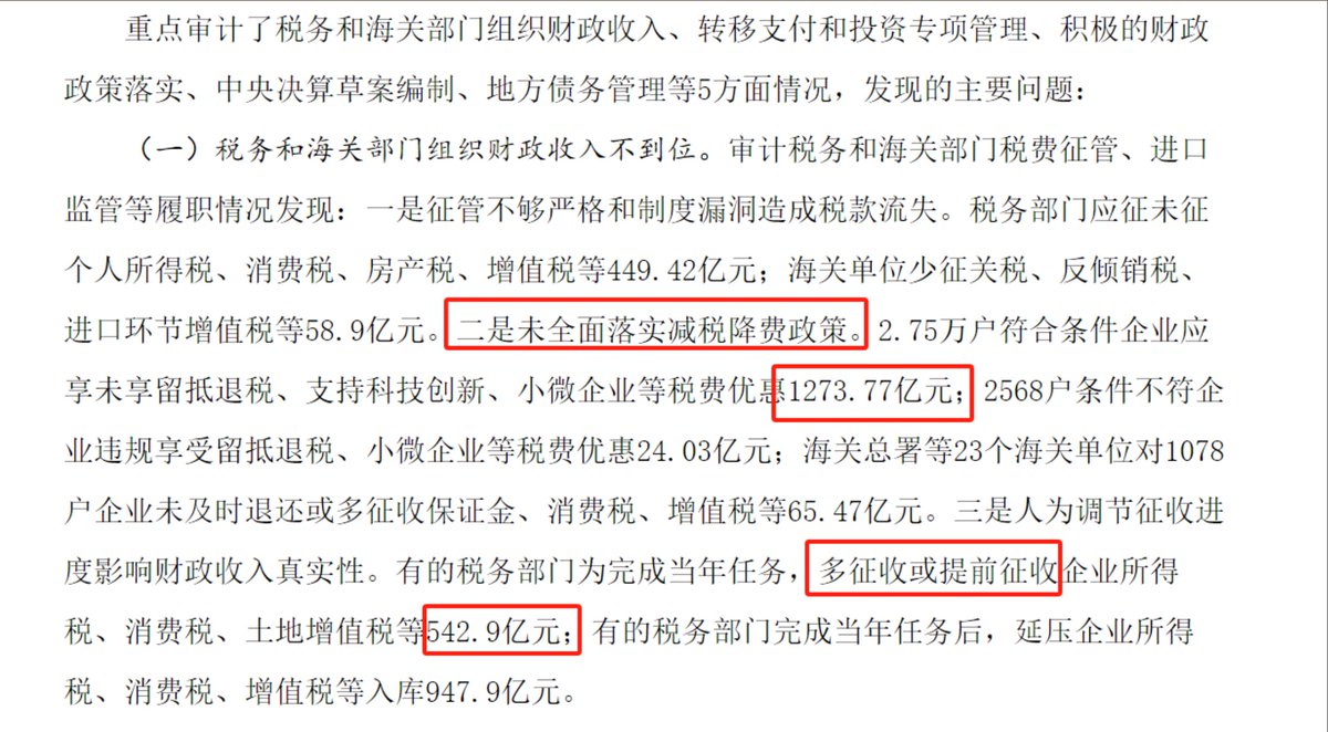《国务院关于2023年度中央预算执行和其他财政收支的审计工作报告》关于税收的部分:2.75万户符合条件企业应享未享留抵退税、支持科技创新、小微企业等税费优惠1273.77亿元;为完成当年任务,多征收或提前征收企业所得税、消费税、土地增值税等542.9亿元。