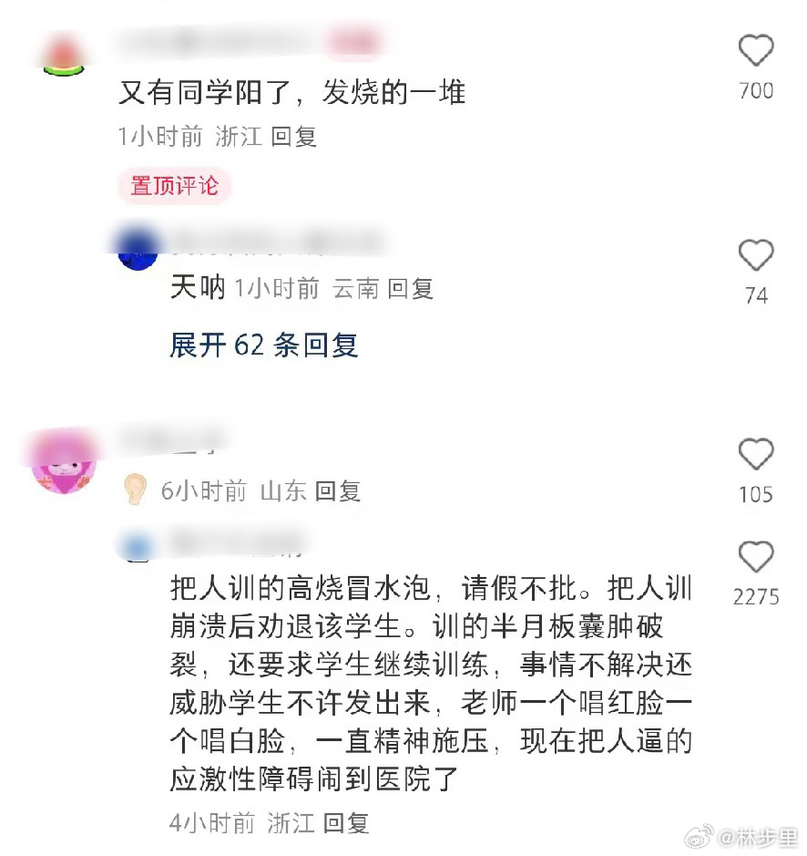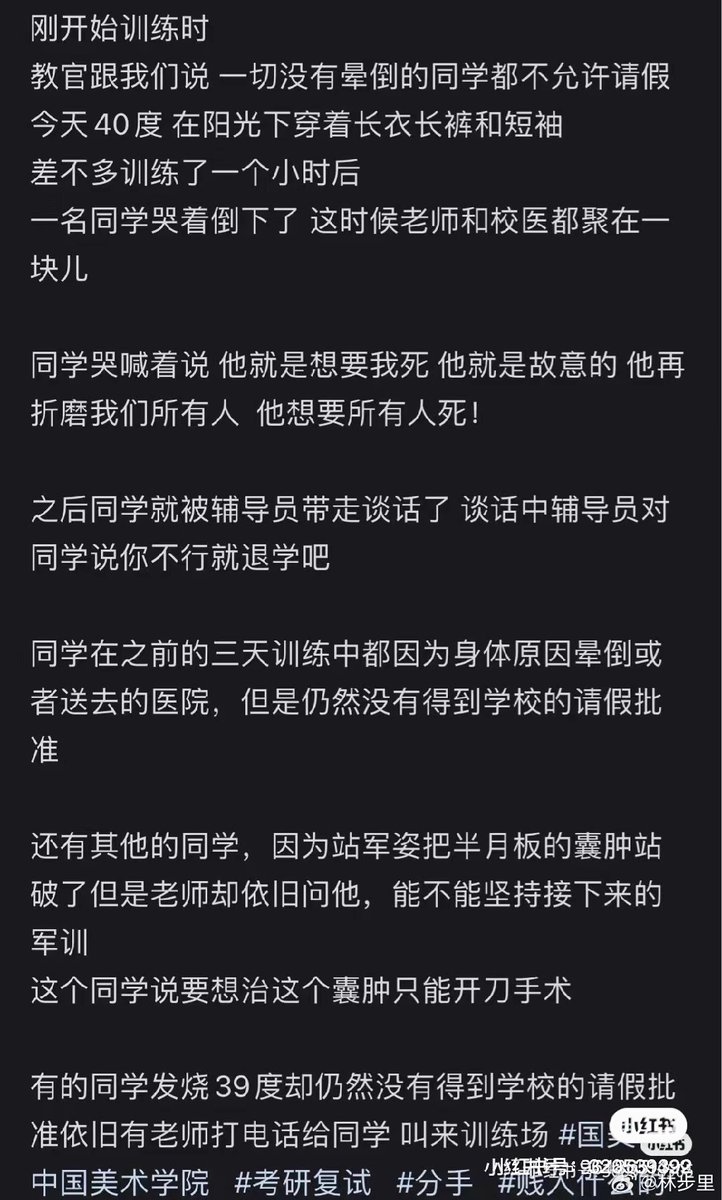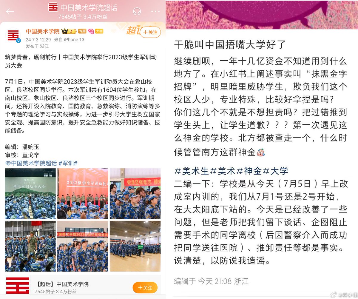 7月5日,浙江杭州。多名学生反映,中国美术学院于7月1日开始军训,期间有一堆学生发烧,半月板囊肿破裂,学校不仅不批假,还要求学生顶着高温继续训练,并威胁学生不许将此事发出来。