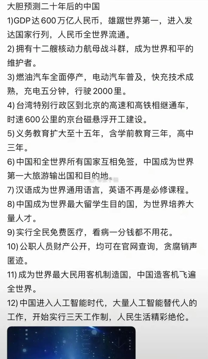 太好了,有希望了,这是墙内最近疯传,对中国未来20年的预测大家说说看,可以实现哪几条?🙏🥹