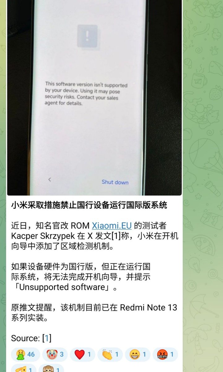 7月9日报道,近日,小米公司采取了一项新措施,限制在中国大陆地区销售的设备安装小米国际版系统。如果用户尝试在国行版设备上刷机安装国际版系统,设备将在开机引导中显示“不支持”,并无法进入系统。这一限制在Redmi Note 13系列上已经实施。