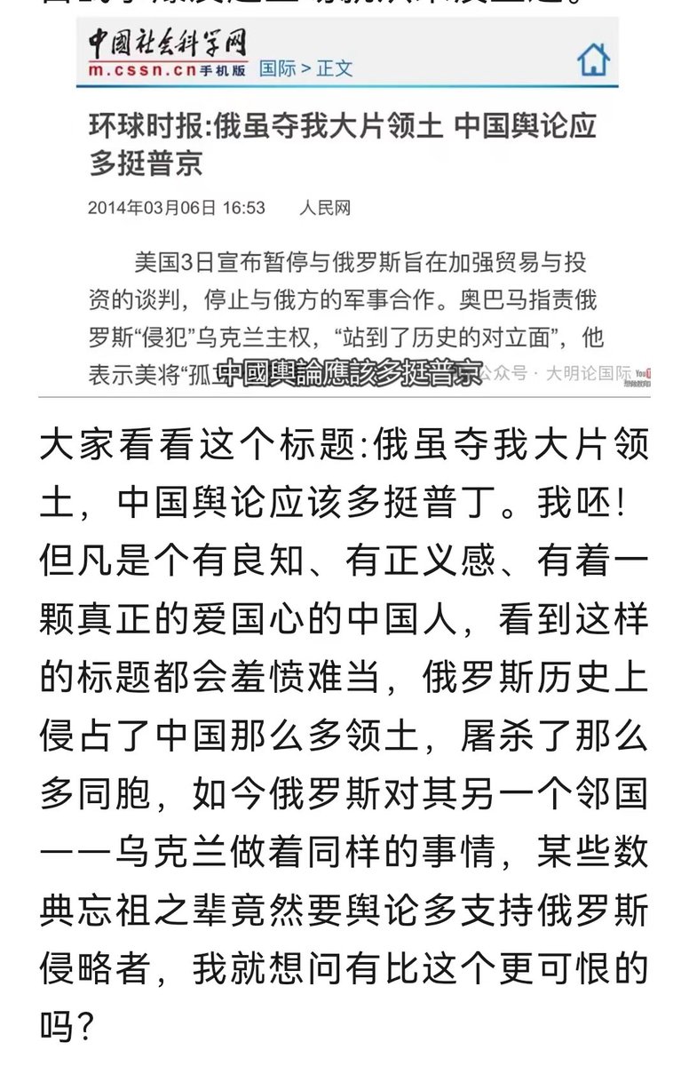 媒体已是太监,学术机构彻底沦为娼妓……中國社会科学网 国际>正文【环球时报:俄虽夺我大片领土 中国舆论应多挺普京】2014年03月06日 人民网