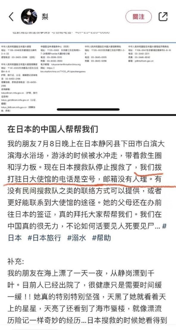 近日一名20岁中国籍女游客在日本一处海滨浴场被海浪卷走后(所幸36小时后被救助生还),期间其友人多番试图联系中国驻日本大使馆无果。但中国驻日本大使馆却自称第一时间协调当地警力全力搜救。但是最需要你的关键时刻,根本都找不到你❗️驻日本大使馆为什么不也用日文发布这个通告❓