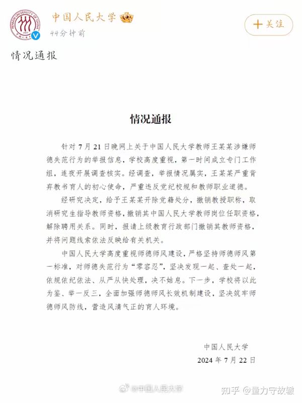 中国人民大学还是挺果断的,这么快就出了结果,把涉嫌性骚扰女学生的文学院党委书记王贵生,开除党籍和职位,还准备移交司法机关追究刑事责任。这应该是几年来中国学术圈metoo运动中处置最快最严厉的了