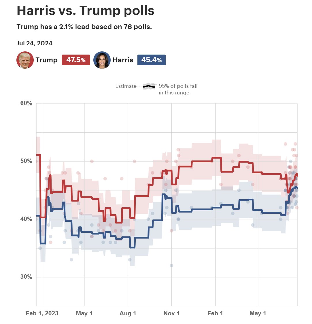 目前美国民调显示哈里斯,虽然落后于川普但并非完全没有赢面The Hill统计了76份民调,目前哈里斯平均下来落后川普2.1%在其中部分的民调中,比如路透社的民调中,哈里斯反而领先了2%并且根据The Hill的调查, 在换成哈里斯后,民主党支持率有了显著的提升就目前看来,换人还是一个比较正确的决定